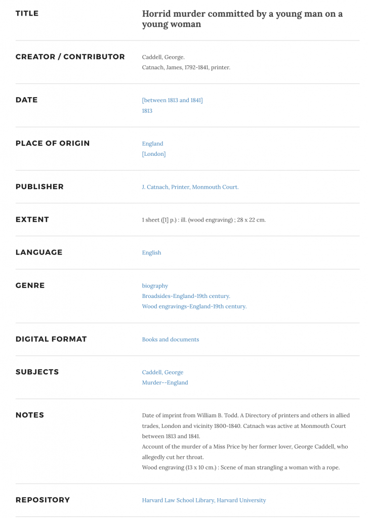 On their respective information page, each broadside has a set of notes, including a vivid ‘alt-text’ like description of the engraving, each specially crafted.