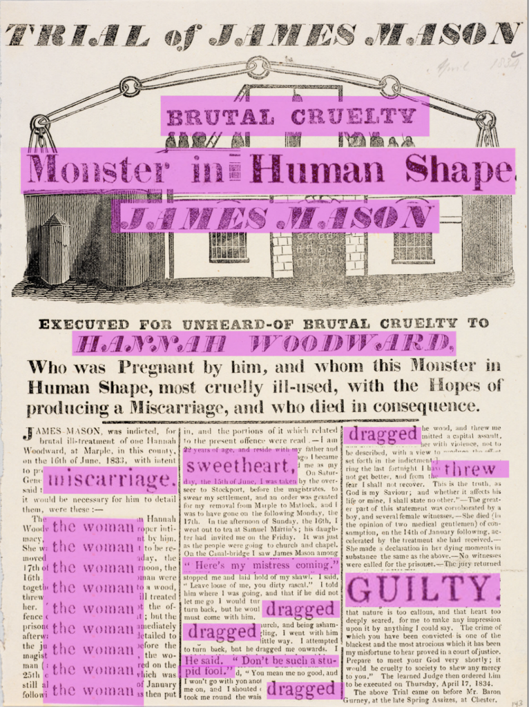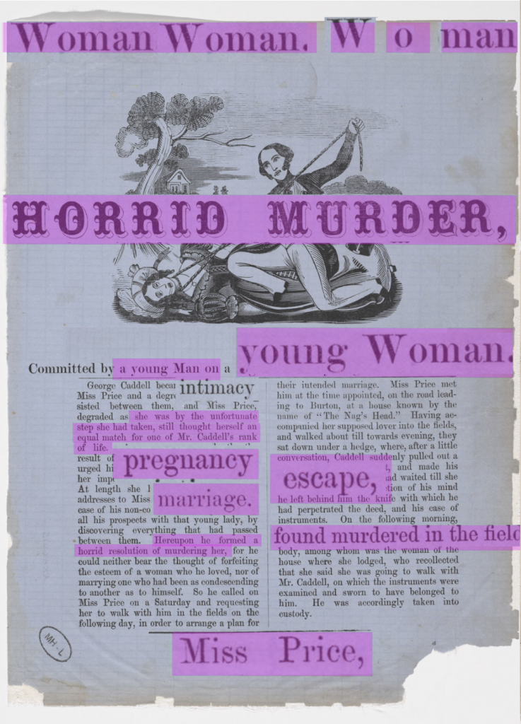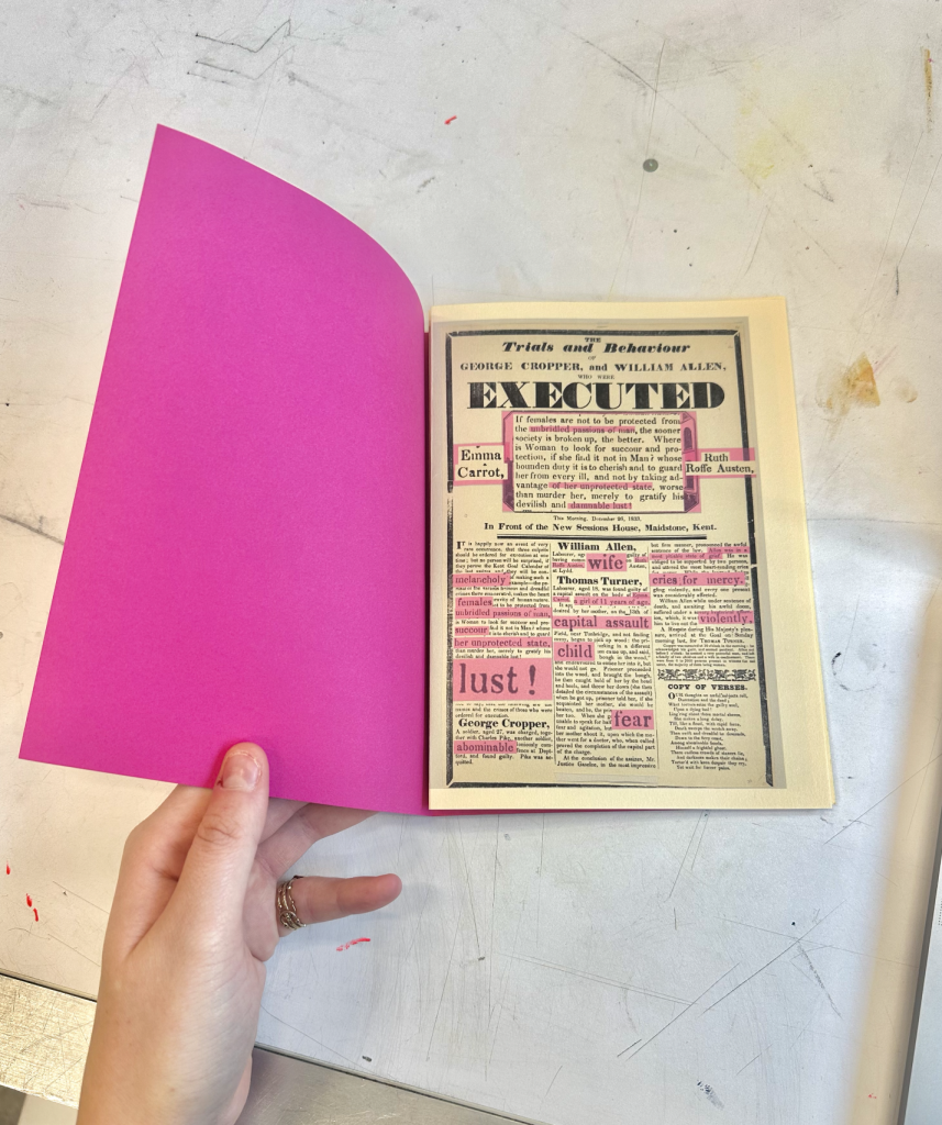 These broadsides now re-told the story differently, changing the narrative where women were often referred to as “someone’s wife” to a person with a name and agency. Pursuing this idea of dual existence between past and present, I thought it would be interesting to denounce the perpetuation of femicides in a publication which itself listed as a dialogue between past and present. I therefore decided to explore screen-printing techniques for the cover of the publication.