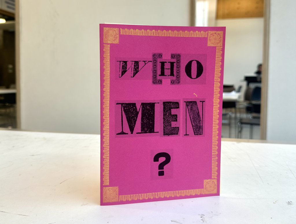 I intended to use letterpress in order to keep the aesthetic of the cover consistent, but due to time constraints, I ended up having to take letters from the initial broadsides in order to make the title “W(H)O MEN” and print them. I think, looking back, this further mix of past and present adds to the value of this little publication.