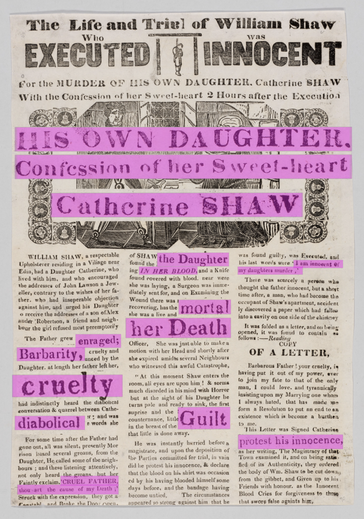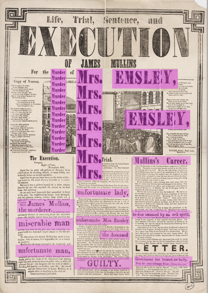 Looking at all the execution broadsides (only a small collection here), I was very intrigued to see the word “execution” over and over again, and therefore decided to take them apart from their context. I made sure to only select occurrences where the typographic style of each “execution” was different from other ones previously selected.
